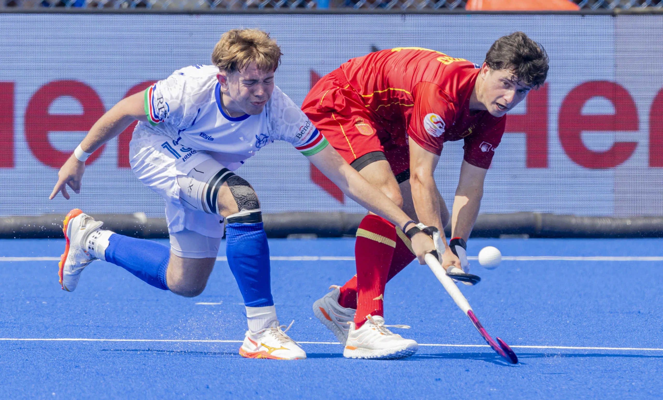 Comenzó España buscando la portería rival y tras varias apariciones en el área, Andrés Median provocó un primer Penalti Córner que Bruno Ávila no desaprovechó y con el que logró marcar el primer gol para España, en el minuto 10. Un minuto después, Pere Amat entraba en el área con bola controlada y asistía a Andrés Medina, que con su disparó batió a Lyle Bruys. A falta de 25 segundos, Pere Amat se revolvía en medio del área y con tu tiro a puerta provocaba un nuevo PC, pero el guardameta estuvo acertado esta vez. Sin embargo, nada pudo hacer con una bola que quedó rebotada tras disparo de nuevo de Amat y y que Albert Serrahima cazó para marcar el 3-0.